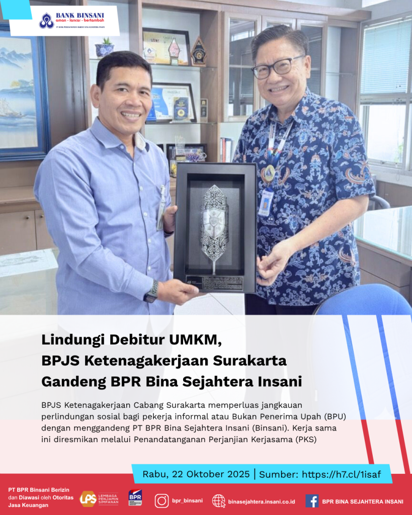 BANK BINSANI berkolaborasi dengan BPJS Ketenagakerjaan Cabang Surakarta memberikan perlindungan sosial bagi pelaku UMKM dan pekerja non-upah.