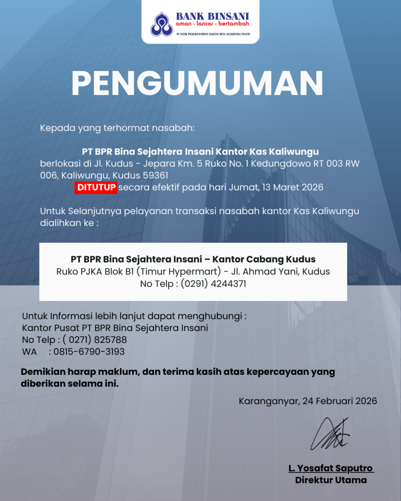 Sehubungan dengan penyesuaian jaringan layanan, Kantor Kas Kaliwungu PT BPR Bina Sejahtera Insani resmi ditutup efektif per 13 Maret 2026.